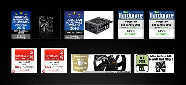 Bei den European Hardware Awards wählte die Community der teilnehmenden Magazine den SilentWings 3 zum besten Lüfter des Jahres, während die Fachjury, bestehend aus Redakteuren aller involvierten Magazine, den Dark Rock Pro 3 und das Dark Power Pro 11 zum zweiten Mal in Folge als besten Luftkühler und beste Netzteilreihe auszeichnete.