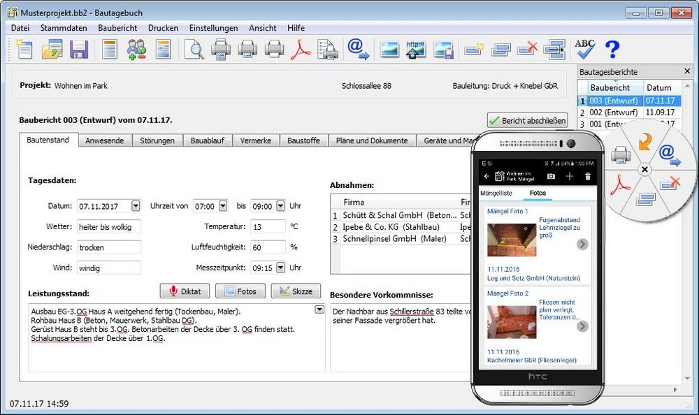 Funktionen: neben den für Bautagebücher üblichen Kategorien sind zusätzlich ein vollwertiges Mängelmanagement mit Fotofunktion, Arbeitszeiterfassung (Baubesetzung), Geräte- und Maschinenmanagement, sowie Plan- und Dokumentenverwaltung integriert.