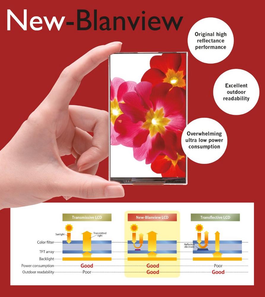 Beste Ablesbarkeit und farbgetreue Darstellung unter nahezu allen Lichtbedingungen, also auch bei voller Sonneneinstrahlung, und ein weiter Blickwinkel sind wesentliche Merkmale der Blanview-Technologie. Blanview-Displays warten gegenüber den herkömmlichen transmissiven Displays außerdem mit einer um bis zu 60 Prozent geringeren Leistungsaufnahme auf. All diese Vorteile erlauben kompakte Designs und lange Akkulaufzeiten – heutzutage Grundvoraussetzung für moderne Produkte.