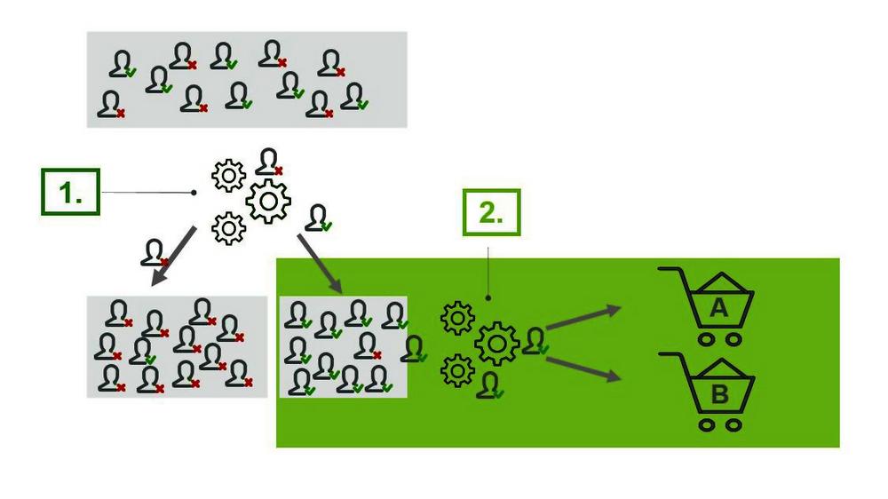Die gezielte Ansprache von Bestandskunden in Mailings stellt für Direktbanken einen wesentlichen Vertriebskanal dar. Gerade bei postalischem Versand entstehen allerdings hohe Kosten. Zusätzlich empfinden die Kunden nicht-zielgruppengerechtes Marketing als Spam und fühlen sich belästigt. Interessierte Kunden vorab zu identifizieren, spart Kosten und gewährleistet gleichzeitig eine höhere Kundenzufriedenheit. mayato entwickelte dazu basierend auf historischen Kundendaten ein Zwei-Stufen-Modell, das zunächst die Reagierer-Wahrscheinlichkeit und anschließend die Affinität für ein bestimmtes Produkt ermittelt. Die Data Scientists nutzen dafür klassische Data Mining-Algorithmen wie Random Forest, Regressionsverfahren oder neuronale Netze zur Modellierung.