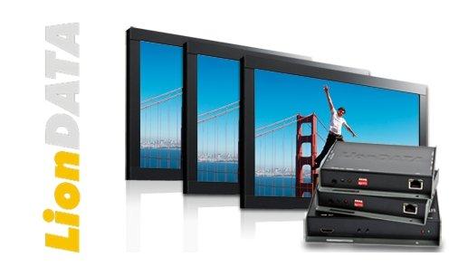 Ein LionDATA AVX-IP-HDMI Transmitter/ Sender wird über ein HDMI-Kabel an den Mediaplayer angeschlossen und mit dem Netzwerk verbunden. An die Bildschirme wird jeweils ein LionDATA AVX-IP-HDMI Receiver / Empfänger per HDMI angeschlossen und mit demselben Netzwerk verbunden, in dem sich auch der Transmitter befindet.