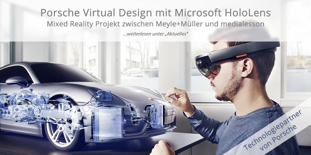 Aus diesem Grund haben Mitarbeiter des Virtual Designteams von Porsche zusammen mit den Grafikspezialisten des Pforzheimer Mediendienstleisters Meyle+Müller und den Software-Entwicklern von medialesson vor einigen Monaten damit begonnen eine tiefgreifende technische Evaluation durchzuführen mit dem Ziel, den Design-Prozess signifikant zu beschleunigen bei gleichzeitiger hoher Kosteneinsparung. Im Rahmen der hierzu begründeten Technologiepartnerschaft wurden Mixed Reality Applikationen entwickelt, die sich die besondere Wirkungsweise der Microsoft HoloLens zu Nutzen machen. Durch das klare Visier der Brille sieht der Benutzer die ihn umgebende Realität unverändert, allerdings erweitert um holografische Elemente. Dadurch wird es möglich an einem realen Clay-Modell Design-Varianten zu visualisieren.