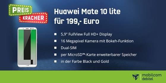 Das Huawei Mate 10 lite ist als Preiskracher-Angebot unter https://www.mobilcom-debitel.de/kracher ab Samstag, den 28. Juli, erhältlich. Den richtigen regionalen Ansprechpartner gibt es unter https://www.mobilcom-debitel.de/online-shop/haendlersuche. Das Angebot ist nur in limitierter Auflage erhältlich und gilt bis einschließlich Sonntag, den 29. Juli, und nur solange der Vorrat reicht.
