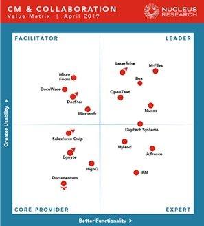 Nucleus Research bewertet ECM-Anbieter nach den zwei wichtigsten Kriterien Benutzerfreundlichkeit und Funktionalität. Die Bewertung basiert auf der Analyse von Interviews mit Endanwendern und laufenden Untersuchungen des Research-Unternehmens. Der 2019er Report enthält Bewertungen von 17 Anbietern. Die Nucleus Value Matrix stellt die Bewertung in vier Quadranten – Leader, Expert, Facilitator und Core Provider – dar.