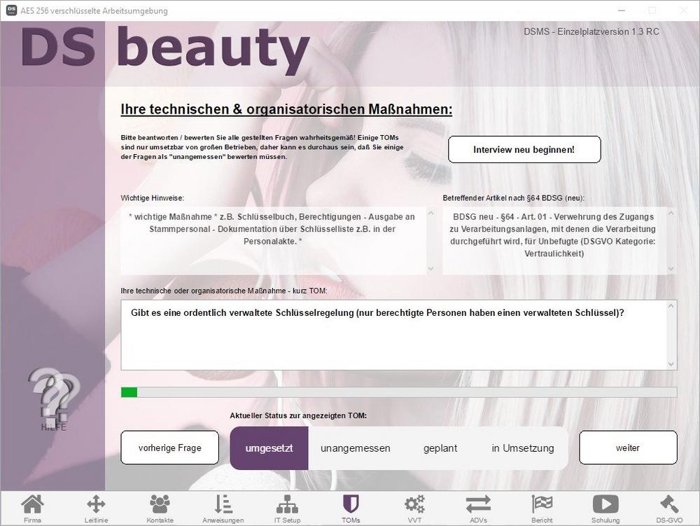 Gerade Kosmetikstudios sind aufgrund der notwendigen Erhebung von kritischen Daten verpflichtet, die DS-GVO sehr genau einzuhalten. Besonders kleine Studios sind mit der Umsetzung aber oft überfordert. Hier hilft die App „DS beauty“ den Institutsleitungen, über leicht zu verstehende Interviews die DS-GVO in Eigenregie korrekt umzusetzen.