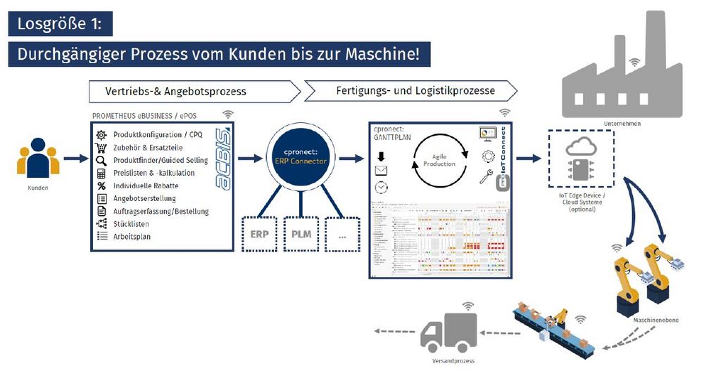 PROMETHEUS eBUSINESS unterstützt die genannten Anforderungen an das zuvor beschriebenes Webportal. Mit dem integriertem Produktkonfigurator ePOS PRO können Sie darüber hinaus viele relevanten Fertigungsinformationen (technische Merkmale, technische Dokumente, Stücklisten, Arbeitspläne, Daten für den digitalen Zwilling) bei der Auftragserfassung automatisch erzeugen und an die weiterverarbeitenden Systeme übertragen.