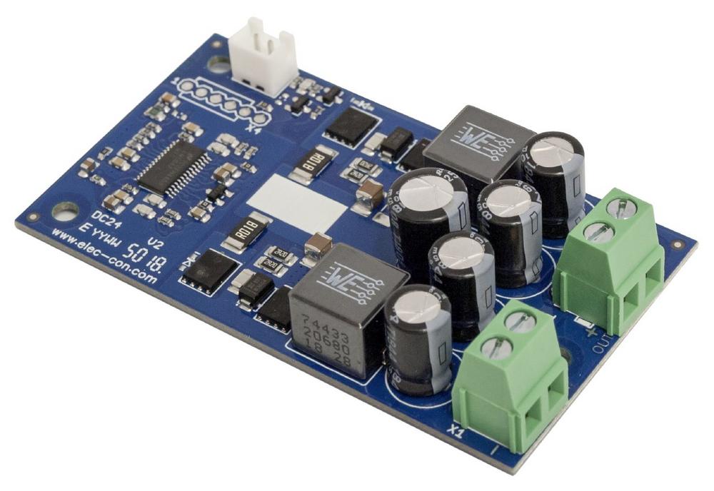 Der DC2412-250 verfügt über eine Eingangssicherung, einen Verpolschutz durch mechanisch kodierte Steckverbinder sowie eine Überlastabschaltung. Die Platine entspricht UL94V-0. Kundenspezifische Anpassungen, wie z.B. ein Enable-Eingang, sind ebenso möglich, wie alternative Ausgangsspannungen oder Anschlussmöglichkeiten via Flachsteckzungen oder Lötflächen. Als Zubehör sind fertig konfektionierte Anschlusskabel lieferbar.