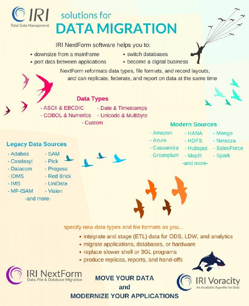 Die IRI Voracity-Plattform oder die IRI Datenmanagement-Suite und insbesondere deren Produkt-Komponent NextForm erfüllen eine Vielzahl von Datenmigrations- und Replikationsanforderungen schneller und kostengünstiger als herkömmliche Anbieter- und Speziallösungen.