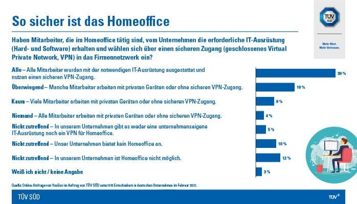 Durch die Coronapandemie arbeiten viele Beschäftigte seit über einem Jahr weitgehend oder sogar ganz im Homeoffice. Cyberkriminelle hatten deshalb oft leichtes Spiel. Eine repräsentative Umfrage von TÜV SÜD zeigt, dass die Unternehmen in Deutschland ihre IT-Sicherheit und Schulungsmaßnahmen inzwischen an das „New Normal“ angepasst haben.