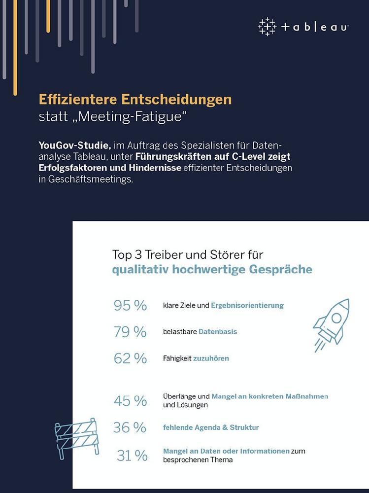 Die Integration von visualisierten Daten in Meetings ist mit dem richtigen Tool ganz einfach, beispielsweise mit den Business-Dashboards von Tableau. Die Visual-Analytics-Plattform zeigt neue Wege für die Nutzung von Daten zur Lösung von Problemen auf. "Wir arbeiten gemeinsam mit unseren Kunden an Strategien und unterstützen sie dabei, ihre Mitarbeiter in die Lage zu versetzen, Daten zu analysieren und wichtige Erkenntnisse zu gewinnen, damit Entscheidungen zum richtigen Zeitpunkt getroffen werden können. Diese qualitativ hochwertigen Diskussionen sind gut für das Geschäft – sie ermöglichen es, schneller, innovativer und nachhaltiger zu werden und unterschiedliche Denkweisen zusammenzubringen", sagt Dan Pell, EMEA GM und SVP bei Tableau. Saagar Weth, Data Analytics Team Leader bei BMW, ergänzt: "Fragen können während der Meetings direkt gestellt und beantwortet werden, anstatt sie im Nachgang zu klären. Das verändert die Dynamik von Meetings völlig – die Konversation konzentriert sich darauf, warum etwas passiert, nicht was."