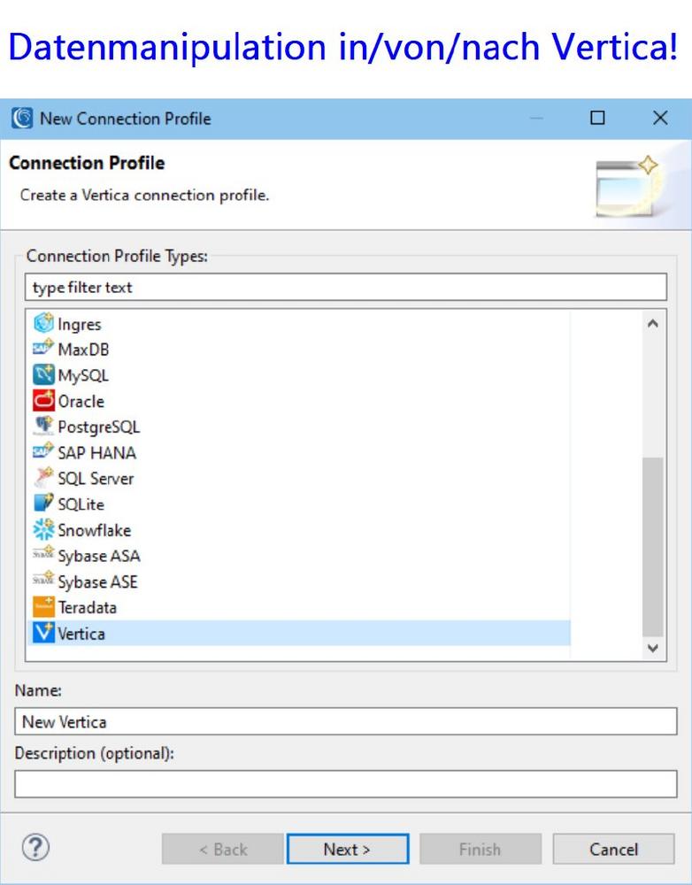 Dieser Artikel beschreibt detailliert, wie man Vertica-Quellen erreicht. Er beschreibt die ODBC- und JDBC-Verbindungen und Konfigurationen, die erforderlich sind, um Vertica mit der SortCL-Engine und dem IRI Workbench Job Design Client zu registrieren, die den meisten IRI-Softwareprodukten, die strukturierte Datenquellen verarbeiten, gemeinsam sind.