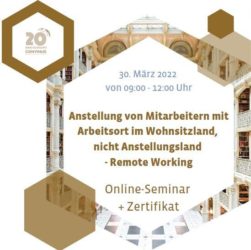 Grenzüberschreitende ErwerbstätigkeitOnline-Seminar + Zertifikat Thema: Anstellung von Mitarbeitern mit Arbeitsort im Wohnsitzland, nicht Anstellungsland – Remote Working am 30. März 2022 von 09:00-12:00 Uhr Aufgrund der COVID-19-Pandemie haben Unternehmen vermehrt Mitarbeiter im Ausland angestellt, ohne dass sie hierfür in das […]