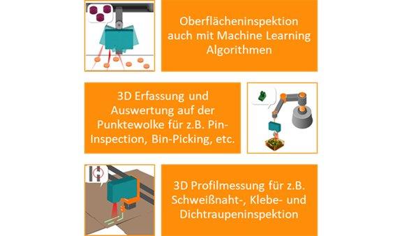 – 3D Erfassung und Auswertung auf der Punktewolke für z.B. Pin-Inspection, Bin-Picking, etc.