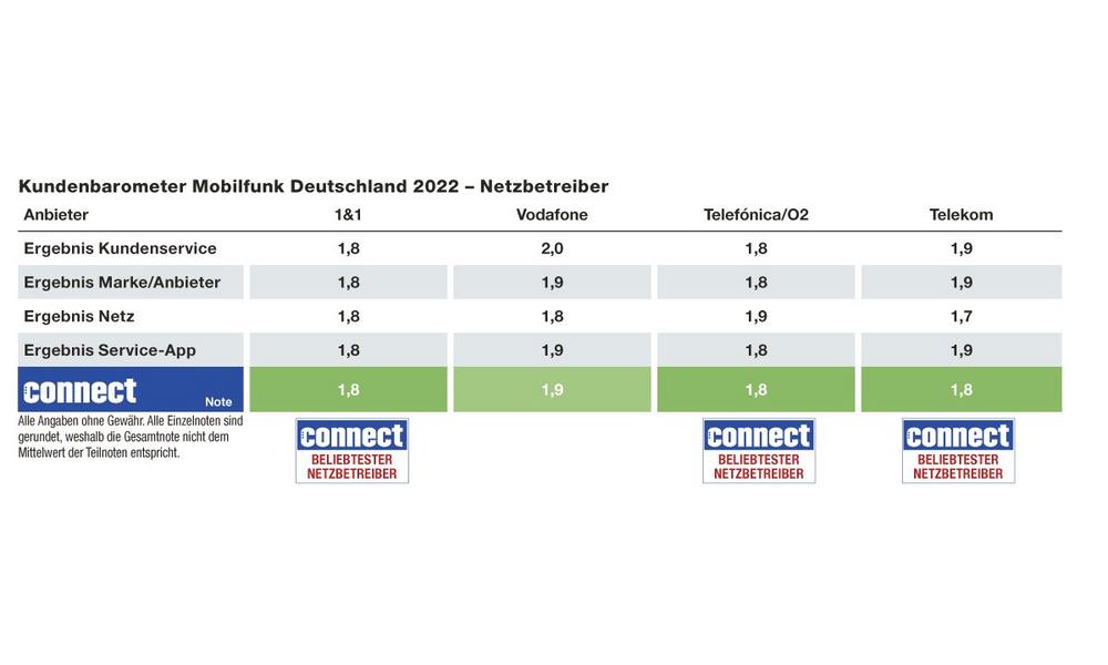 In Deutschland teilen sich die Mobilfunk-Netzbetreiber Telekom, Telefónica/O2 und 1&1 in der Gesamtwertung den ersten Platz mit der Endnote 1,8. Vodafone erreicht den zweiten Platz und eine respektable 1,9. Mit dem Kundenservice sind 1&1- und Telefónica/O2-Kunden am zufriedensten, beide Anbieter erhalten hier die Note 1,8. Die beliebesten Mobilfunkmarken sind ebenfalls 1&1 und Telefónica/O2, in der Gesamtwertung dieser Kategorie erreichen die Anbieter die Note 1,8. Das beste Netz hat laut Studie auch im Jahr 2022 die Telekom. In der Rubrik Service-App sind die Kunden von 1&1 und Telefónica/O2 am zufriedensten, beide erreichen die Note 1,8. Die Telekom und Vodafone erzielen mit 1,9 ebenfalls eine gute Bewertung.