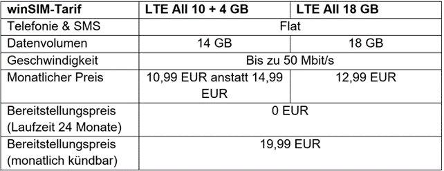 Die Aktionstarife LTE All 10 + 4 GB und LTE All 18 GB von winSIM enthalten neben dem genannten Datenvolumen auch eine Flatrate für Telefonie und SMS. EU-Roaming ist ebenfalls inklusive. Die beschriebenen Aktionen sind bis zum 09. August 2022 um 11 Uhr erhältlich.