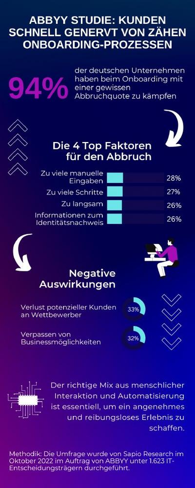 Eine aktuelle Studie des auf intelligente Automatisierung spezialisierten Unternehmens ABBYY deckt auf, dass erschreckende 94% der deutschen Unternehmen beim Kunden-Onboarding eine Form des Abbruchs erleben – einige sogar bis zu 40% und mehr. Ein ineffizientes digitales Onboarding – also die Online-Anmeldung für ein Konto oder eine Dienstleistung – kann dazu führen, dass Unternehmen einen Interessenten verlieren, bevor er überhaupt Kunde wird, was zu Umsatzeinbußen in Milliardenhöhe führt. Gerade in der aktuellen geopolitischen Situation, die eine Rezession und eine anhaltend hohe Inflation mit sich gebracht hat, können sich Unternehmen das nicht mehr leisten. Die Ergebnisse der Studie verdeutlichen, wie wichtig es ist, dass Onboarding-Prozesse effizient, intuitiv und mit dem richtigen Maß an sowohl persönlicher Kommunikation als auch intelligenter Automatisierung gestaltet werden müssen, um den bestmöglichen Erfolg zu erzielen.