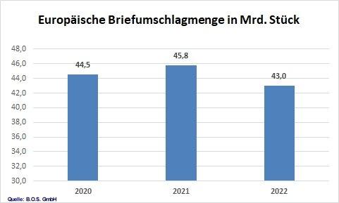 Aufgrund der jetzt vorliegenden Daten für 2022, geht die FEPE von einer Gesamtmenge der in Europa verkauften Briefumschläge und Versandtaschen in Höhe von 43 Mrd. Einheiten (-6% gg. Vorjahr) aus. Durch Preiserhöhungen und das weiter wachsende E-Commerce Geschäft ist aber der Branchenumsatz im Jahr 2022 erstmals seit Jahren wieder gestiegen.