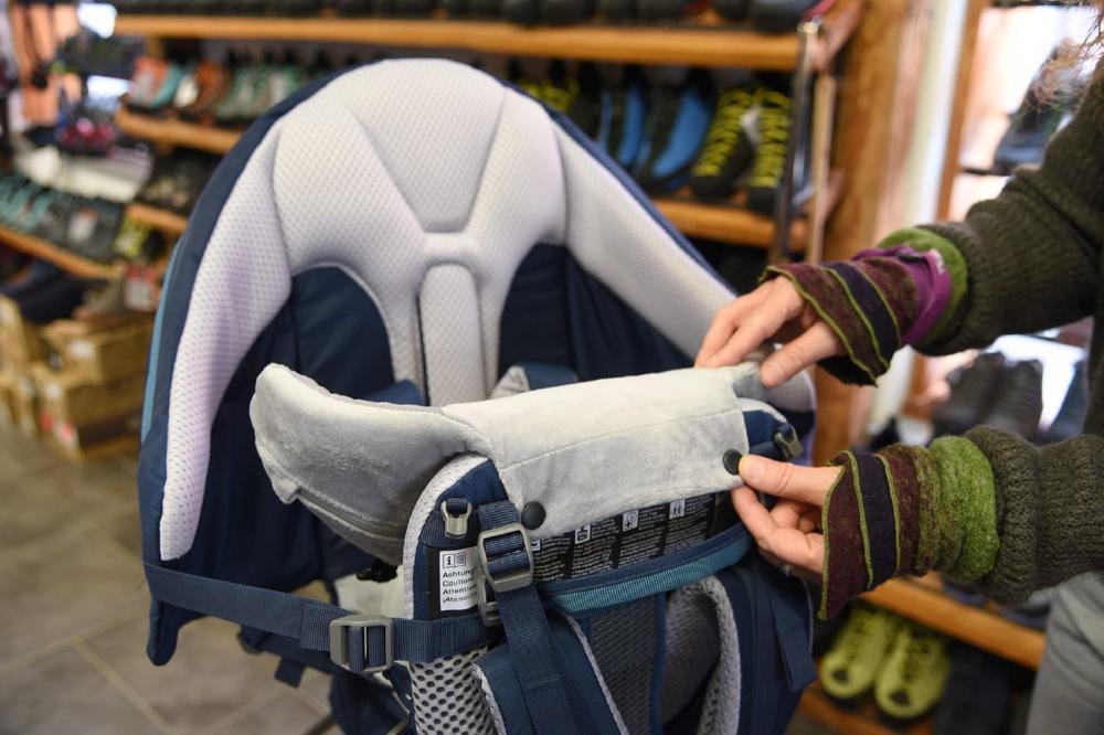 Beim Kauf sollten Eltern vor allem darauf achten, dass das Kind sicher und bequem in der Trage sitzen kann, wie Robert Ziegler erklärt: „Eine gepolsterte Kinn- und Nackenstütze ist besonders bei kleinen Kindern wichtig, damit ihr Kopf während eines Nickerchens optimal abgestützt wird. Außerdem sollte die Trage Fußstützen oder -schlaufen haben, da die Durchblutung der Beine gestört werden kann, wenn sie frei in der Luft hängen. Die Folge wären eingeschlafene Füße. Eine verstellbare Sitzhöhe verhindert eine falsche Sitzposition. Auch die Anschnallgurte müssen natürlich verstellbar sein, viele Hersteller setzen hier auf einen 5-Punkt-Gurt.“ Um das Kind bei Wanderungen ausreichend vor den Elementen zu schützen, sollte die Rückentrage über ein Regen- bzw. Sonnenschutzdach verfügen. Darüber hinaus ist es wichtig, auf ein wasserdichtes und atmungsaktives Material zu achten, das frei von Schadstoffen ist. Besonders, wenn man lange mit der Trage unterwegs sein möchte, sollte ihr Eigengewicht möglichst gering sein.