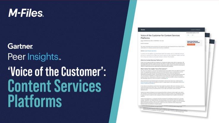 Der neue Report „Gartner Peer Insights ‚Voice of the Customer‘: Content Services Platforms“ bewertet Anbieter auf der Grundlage der folgenden Kategorien: Product Capabilities, Sales Experience, Deployment Experience and Support Experience. In den Gartner Peer Insights finden sich unter anderem die folgenden Antworten von M-Files-Kunden: