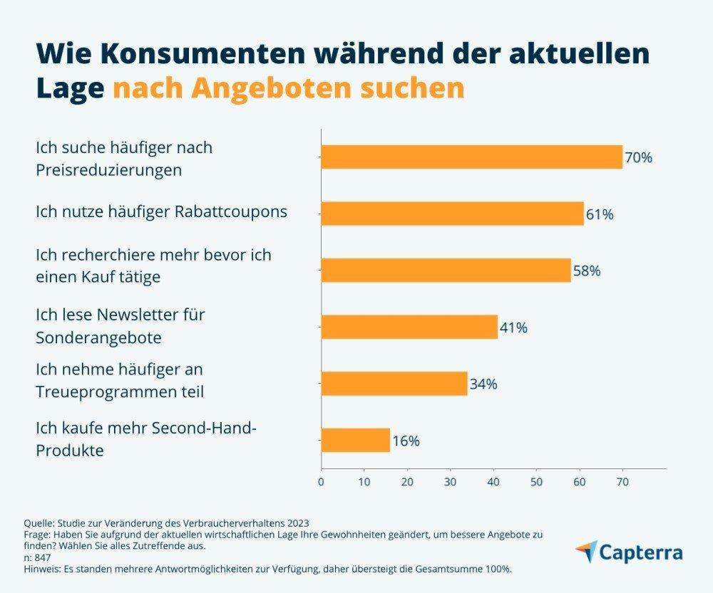 Eine neue Capterra-Studie untersucht, welche Maßnahmen und Technologien Verbraucher in Deutschland nutzen, um mit der aktuellen wirtschaftlichen Situation umzugehen und was Unternehmen aus den an der Inflation angepassten Einkaufsgewohnheiten lernen können. Hierfür wurden über 1000 deutsche Verbraucher befragt.