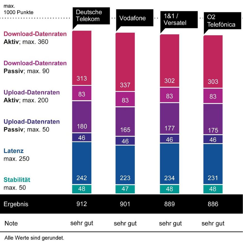 Den zweiten Platz erreicht Vodafone mit 901 Punkten und der Note „sehr gut“. Der Anbieter ist bei den aktiv gemessenen Download-Datenraten führend – hier wirken sich die meist per Breitbandkabel realisierten Gigabit-Anschlüsse aus. Technologiebedingt fallen die Upload-Datenraten etwas geringer und die Latenzen etwas höher aus.