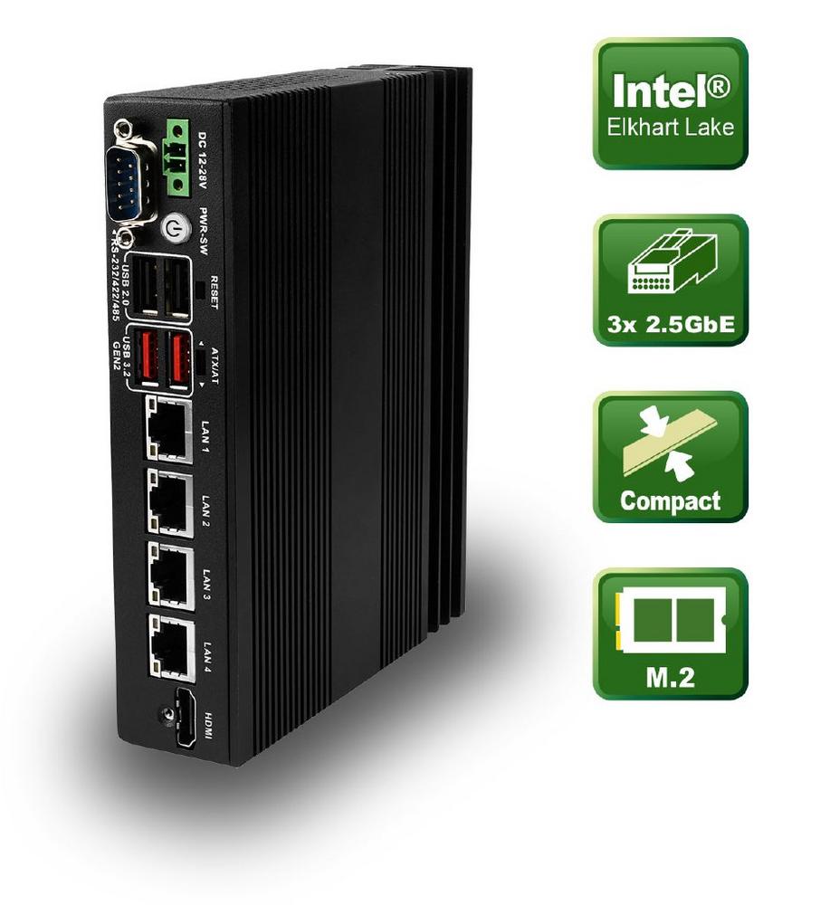 Kompakt durch seine Maße von nur 159x132x35 mm bietet der DRPC-124-EHL Platz für vier Intel® Ethernet-Ports. Diese sind aufgeteilt in eine GbE-Schnittstelle mit I210-Controller und drei 2.5 GbE-Schnittstellen, mit I225V-Controller. Die nur an der Frontseite angebrachten Anschlüsse sowie der neu designte rückseitige Kühlkörper vereinfachen die Montage und Installation im Schaltschrank.