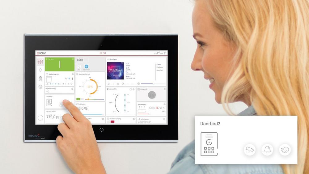 Ab sofort können mehrere Türstationen in die YOUVI-Visualisierungssoftware integriert werden. Bei Gewerbegebäuden bietet sich das vor allem an, wenn sie auf großen Geländen stehen und über mehrere Zugänge wie beispielsweise Wareneingänge oder Hintereingänge verfügen. Im smarten Zuhause ermöglicht das Einbinden der Türstationen in die Logik es außerdem, automatisch Aktionen auszulösen, wenn die Türklingel betätigt wird. So wird beispielsweise die Soundanlage leise geschaltet, wenn es klingelt oder das Licht im Eingangsbereich eingeschaltet, um Besucher zu bestimmten Tageszeiten in heller Atmosphäre begrüßen zu können. Zudem kann auf bestimmten Panels die Klingel stumm geschaltet werden, was ideal für Familien ist, in denen kleinere Kinder zu gewissen Uhrzeiten schlafen. Ein neuer Button im Türstations-Widget ermöglicht darüber hinaus den direkten Zugriff auf die Kamera, ohne, dass es an der Tür geklingelt hat. So haben Bewohnerinnen und Bewohner den Eingangsbereich ihres Smart Homes jederzeit im Blick. Zusätzlich wird ein Türöffner-Button angezeigt, wenn z. B. das Gartentor über KNX oder http angebunden ist.