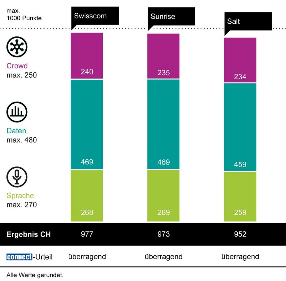 In der Sprachdisziplin liegt Sunrise einen Punkt vor Swisscom; in der Datenwertung liegt der Anbieter gleichauf mit dem Erstplatzierten. Mit 952 Punkten erhält auch Salt die Note „überragend“. Im Crowdsourcing rückt der Anbieter nahe an die zweitplatzierte Sunrise heran, bei Sprache und Daten bleibt der Abstand trotz Top-Leistungen etwas größer.
