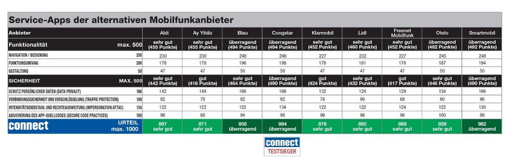 Auch in diesem Jahr ist Congstar Gesamtsieger mit 984 von 1.000 Punkten und der Note „überragend“ – dies entspricht einer Steigerung von beachtlichen 22 Punkten gegenüber dem Vorjahresergebnis. Die App überzeugt mit überragender Menüstruktur und spielend leichter Bedienung. Auch in puncto Sicherheit ist Congstar führend. Auf Platz zwei folgt Smartmobil und sichert sich mit 982 Punkten ebenfalls die Gesamtnote „überragend“. Insbesondere in puncto Sicherheit wurde die App „Smartmobil.de Servicewelt“ verbessert, sodass es zum geteilten Sieg mit Congstar in dieser Kategorie reicht. Blau erreicht mit 958 Punkten Platz drei und erhält ebenfalls die Note „überragend“ – insbesondere das sehr gut strukturierte Menü der „Mein Blau“-App überzeugt, die Sicherheitsergebnisse sind sehr gut. Auf Platz vier kommt Otelo mit 928 Punkten und dem Urteil „sehr gut“. Die App ist klar strukturiert und bietet einen hohen Funktionsumfang. „Mein Otelo“ erreicht in der Sicherheitsüberprüfung als einzige App die volle Punktzahl bei der Absicherung der App-Quellcodes. Auf den weiteren Plätzen folgen Aldi Talk mit 897 Punkten, Lidl mit 892 Punkten, Klarmobil mit 876 Punkten, Ay Yildiz 871 Punkten sowie Freenet Mobilfunk mit 869 Punkten – jeweils mit der Gesamtnote „sehr gut“.