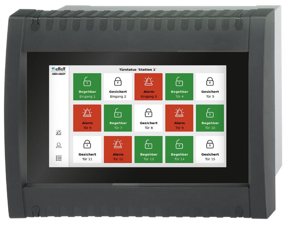 Wahlweise lassen sich mit dem innovativen Bedientableau 8, 15 oder 24 Buttons eines Bedientableaus einfach, intuitiv und flexibel über die zentrale Bedieneinheit konfigurieren (Ansichtsmodi: 4×2, 5×3 oder 6×4 Türen). Hohen Nutzerkomfort bietet neben der kompakten und übersichtlichen Darstellung der jeweiligen Türsituation auch die passwortgesicherte Steuerung der Türen, durch die eine unberechtigte Bedienung wirkungsvoll verhindert wird. Alternativ lässt sich die Bedienoberfläche über einen separaten Schlüsseltaster freigeben oder sperren, dessen Zylinder in die vorhandene Schließanlage integriert werden kann. Die grafische Anzeige von Alarmmeldungen wird durch den integrierten Summer zusätzlich mit einem akustischen Signal unterstützt.