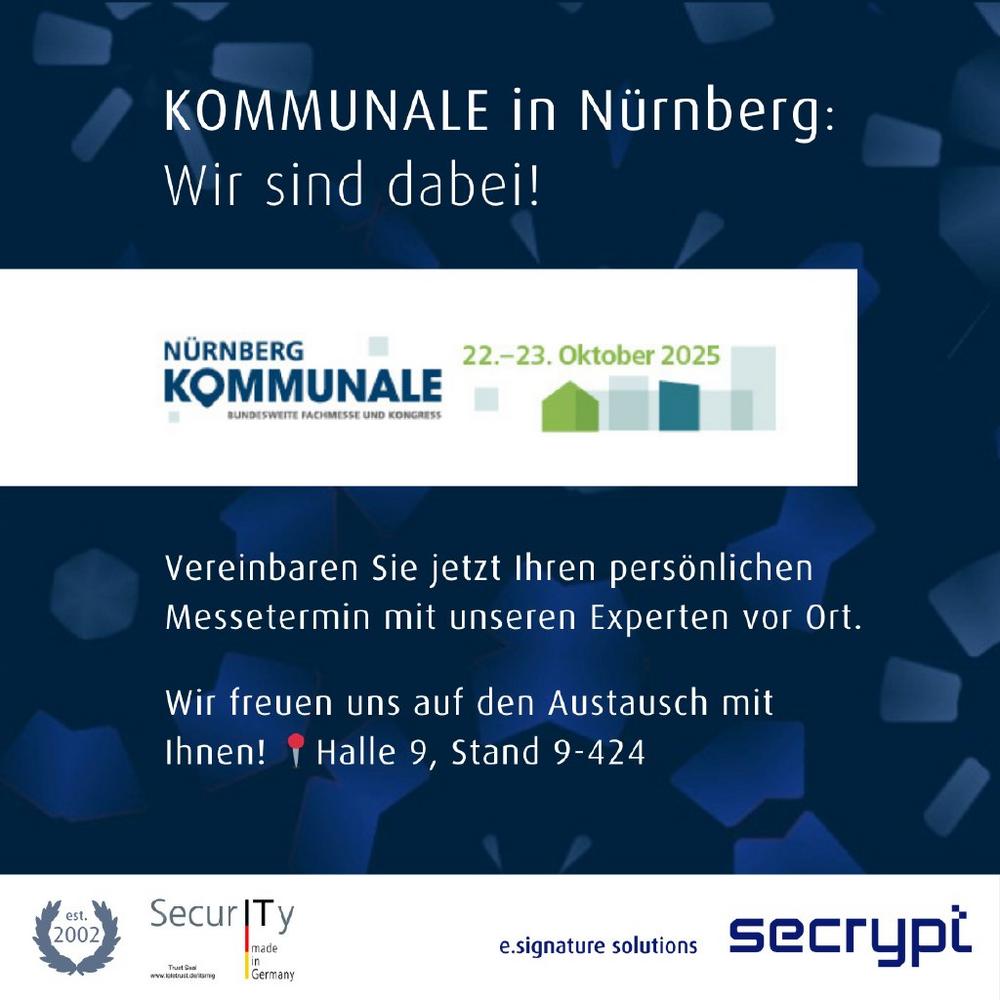 Auch die Signaturexperten von secrypt sind als Aussteller vor Ort und zeigen, wie Kommunen mit elektronischen Signaturen und Siegeln ihre Verwaltungsprozesse effizienter, rechtssicher und zukunftssicher gestalten können.