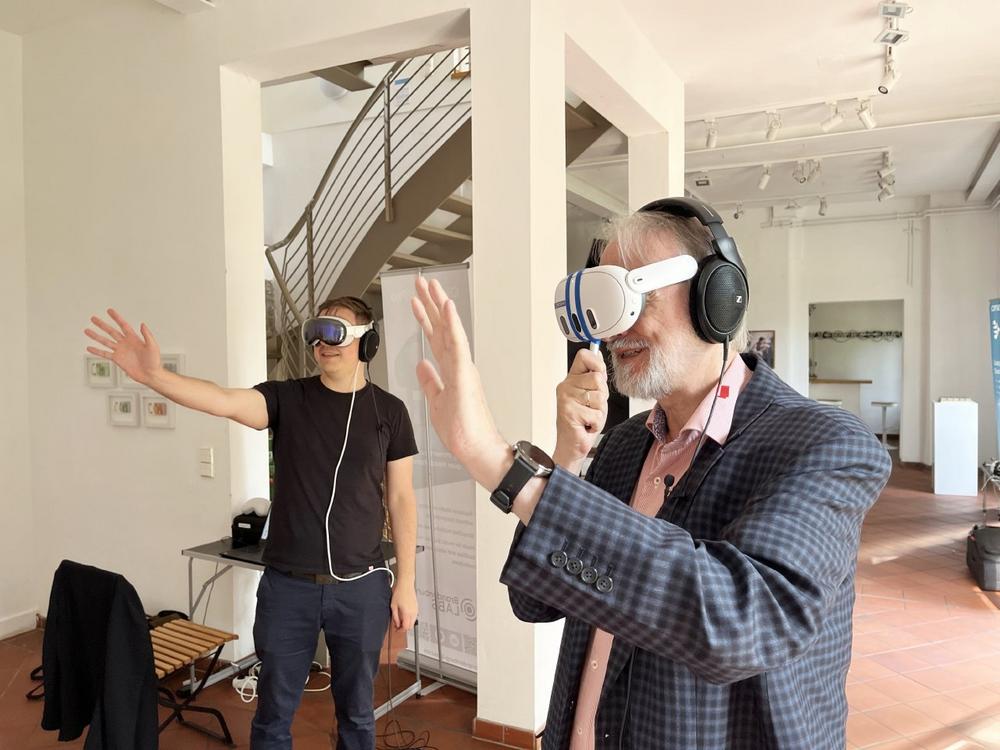 Während der Ergebnispräsentation in Weimar konnten sich die rund 20 Gäste und Vertreter der Projektpartner selbst davon überzeugen, wie innerhalb von MULTIPARTIES-Treffen der Eindruck entsteht, sich mit den anderen Gesprächspartnern tatsächlich zu treffen. Für die Demonstration wurde ein Online-Meeting mit Gruppen von Teilnehmern aus Weimar, Ilmenau, Aachen und Lübeck durchgeführt. Die Teilnehmer trafen sich in einem virtuellen Raum, der aus Repräsentationen der realen Räume aller Teilnehmer zusammengesetzt war. Sie waren nicht, wie es von herkömmlichen Online-Meetings bekannt ist, per Kamerabild zugeschaltet, sondern trugen VR-Brillen, um den Raum immersiv zu erleben.