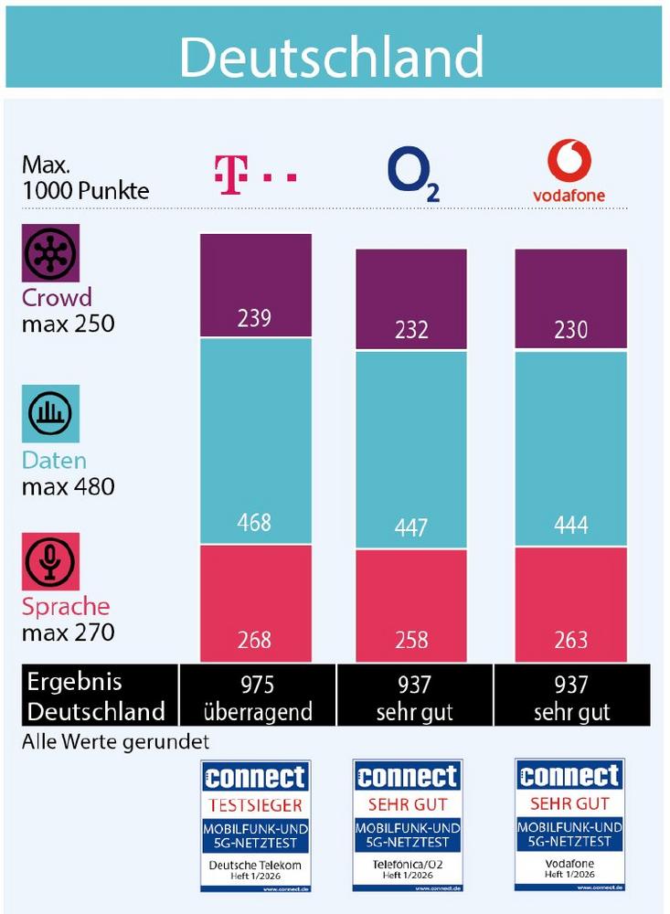 Die Deutsche Telekom erzielt zum fünfzehnten Mal in Folge den Gesamtsieg in Deutschland und zum vierten Mal ein „überragendes“ Gesamtergebnis. Der Anbieter erreicht 975 von 1.000 möglichen Punkten und liegt in allen drei Testdisziplinen – Sprache, Daten und Crowdsourcing – klar vorn. Vodafone und O2/Telefónica erzielen mit 937 Punkten dieselbe Punktzahl und die Gesamtnote „sehr gut“. Dabei erzielt O2/Telefónica mit einem Plus von 28 Punkten die größte Leistungssteigerung im gesamten Testfeld und liegt in der Daten- und in der Crowd-Disziplin sogar vor Vodafone. Vodafone kann in einigen Teildisziplinen zur Telekom aufschließen.