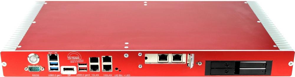 Als CPU kommt ein Intel Pentium oder Xeon zum Einsatz sowie bis zu 128GB ECC DDR5 Speicher. Darüber hinaus lassen sich bis zu zwei interne NVMe SSDs und weitere zwei 2.5“ Laufwerke über Hotplug Schächte realisieren (wahlweise mit RAID1 Spiegelung). Standardmäßig stehen fünf RJ45 ports zur Verfügung: 1x Management LAN, 2x GLAN und 2x 10GLAN. Optional sind entweder zwei weitere 10GLAN RJ45 ports oder zwei SFP+ Einschübe wählbar. Dazu kommen bei Bedarf WiFi 6 (802.11ax) sowie 4G/5G Mobilfunk. Über Letzteres lässt sich beispielsweise eine Fallback-Option realisieren, falls kein kabelgebundenes Internet zur Verfügung steht bzw. ausgefallen ist.