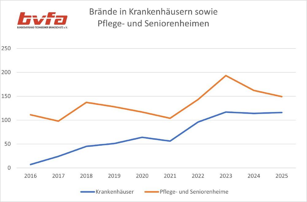 Die häufigsten Brandursachen waren erneut Brandstiftung (rund 50 %) sowie technische Defekte an elektrischen Anlagen (etwa 30 %). Besonders kritisch: Brände entstehen häufig in Patientenzimmern oder Aufenthaltsbereichen und entwickeln sich dort innerhalb weniger Minuten lebensbedrohlich.